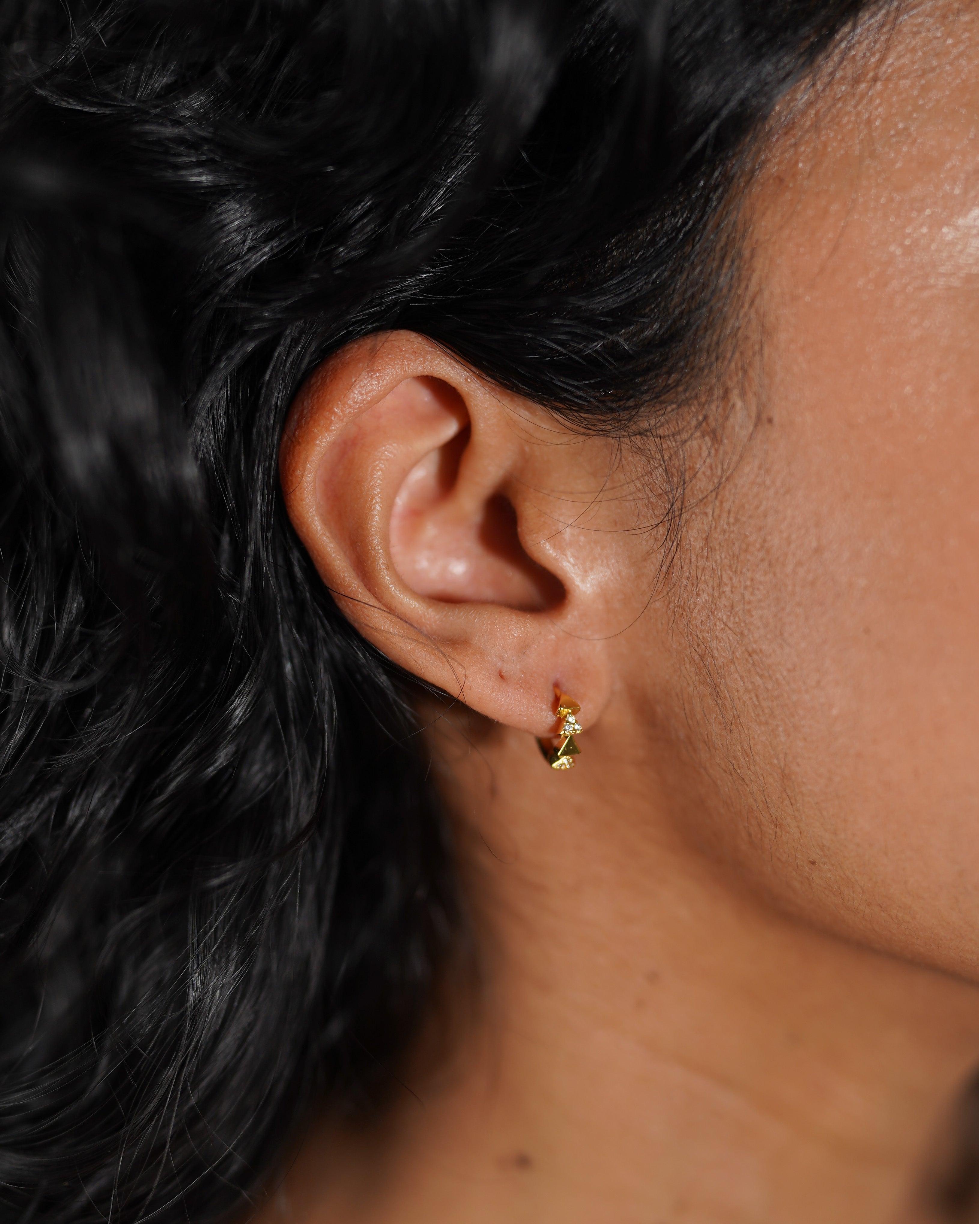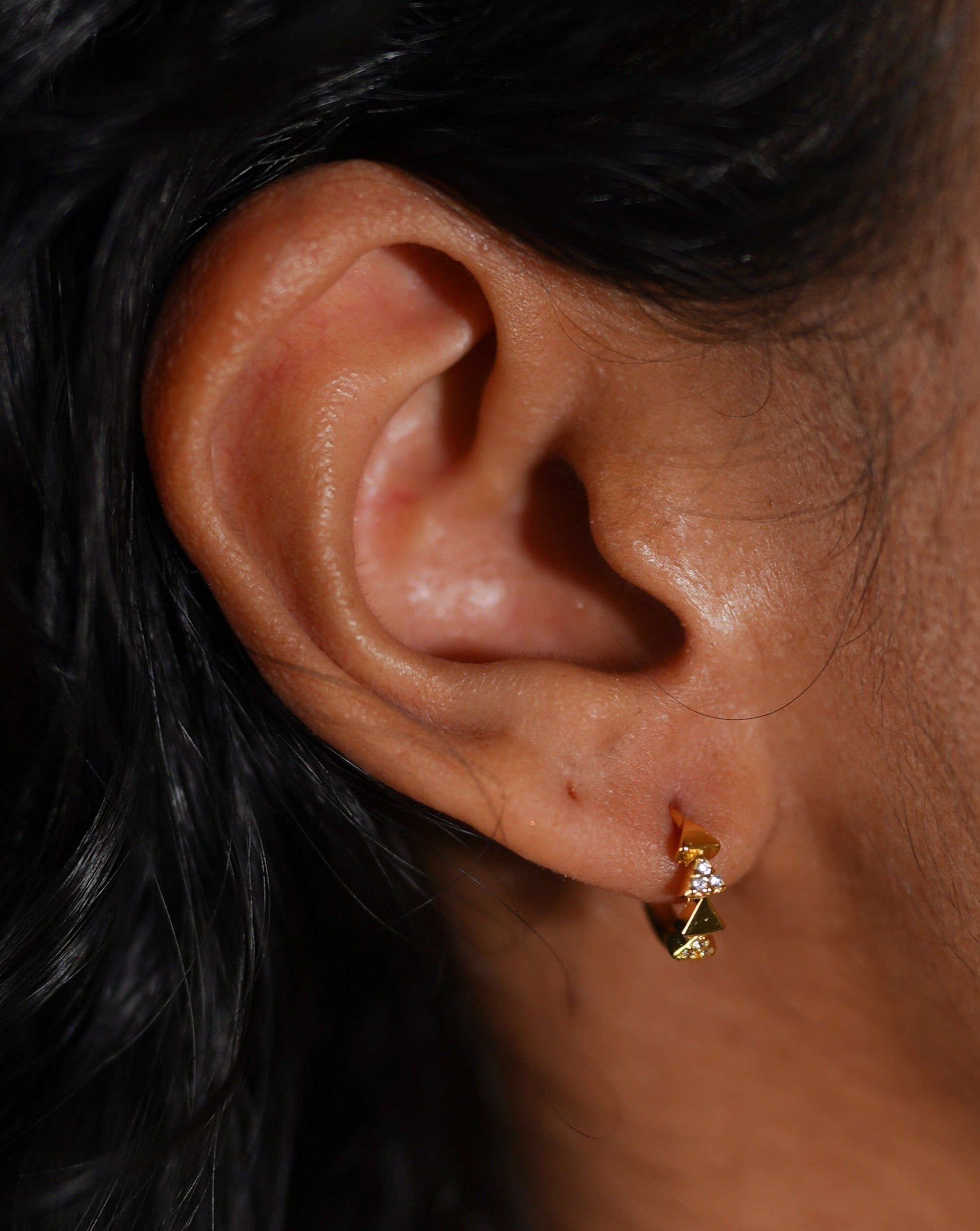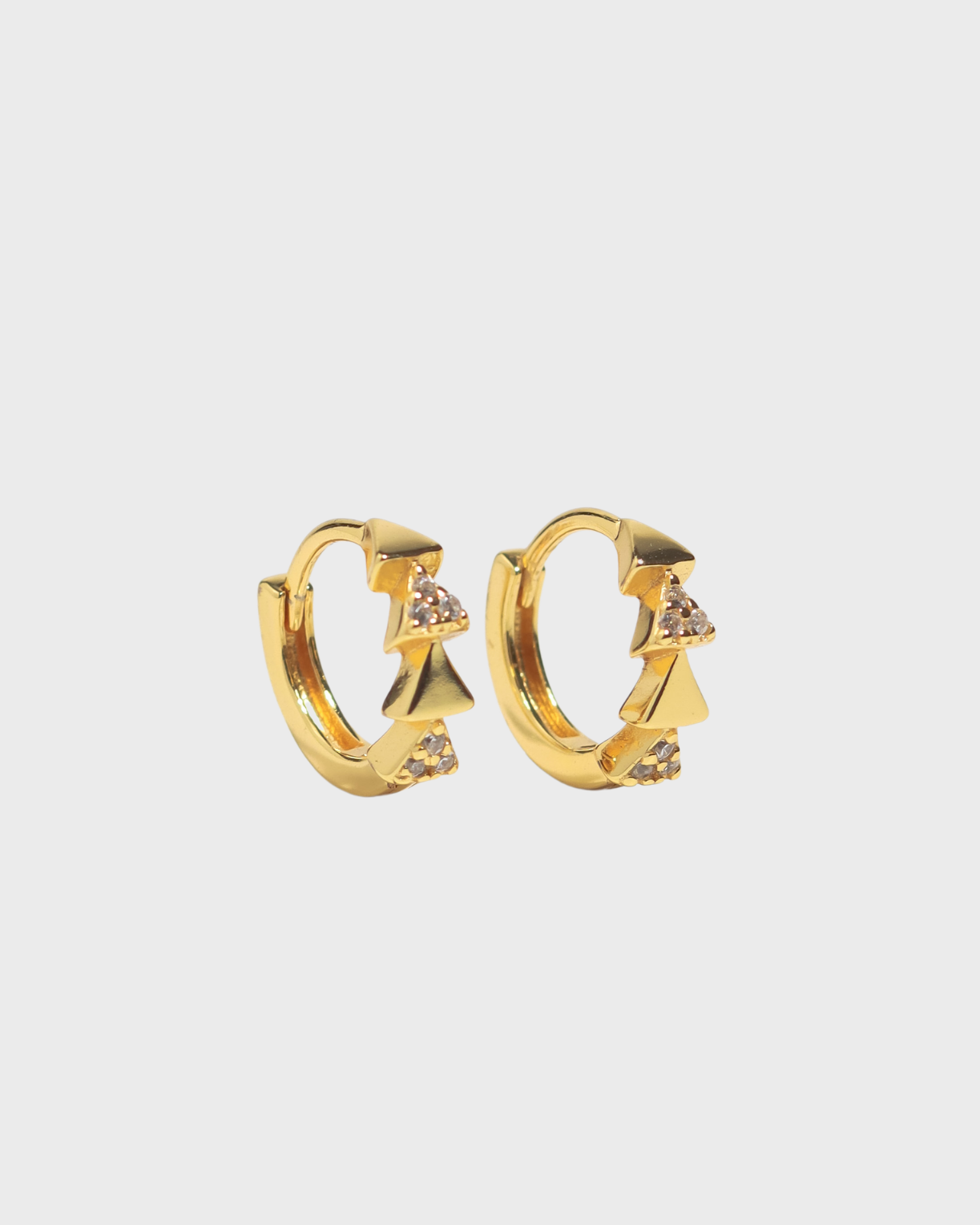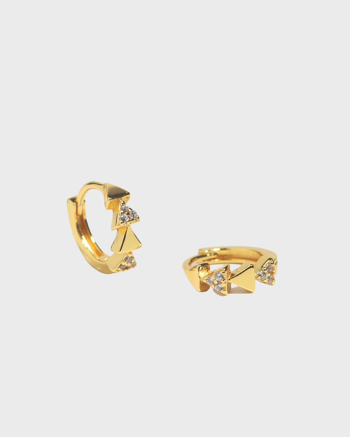Add to a sharp look with our Petite Quartet Huggies. Triangular in form, these huggies feature mini pyramids layered in a vertical line.