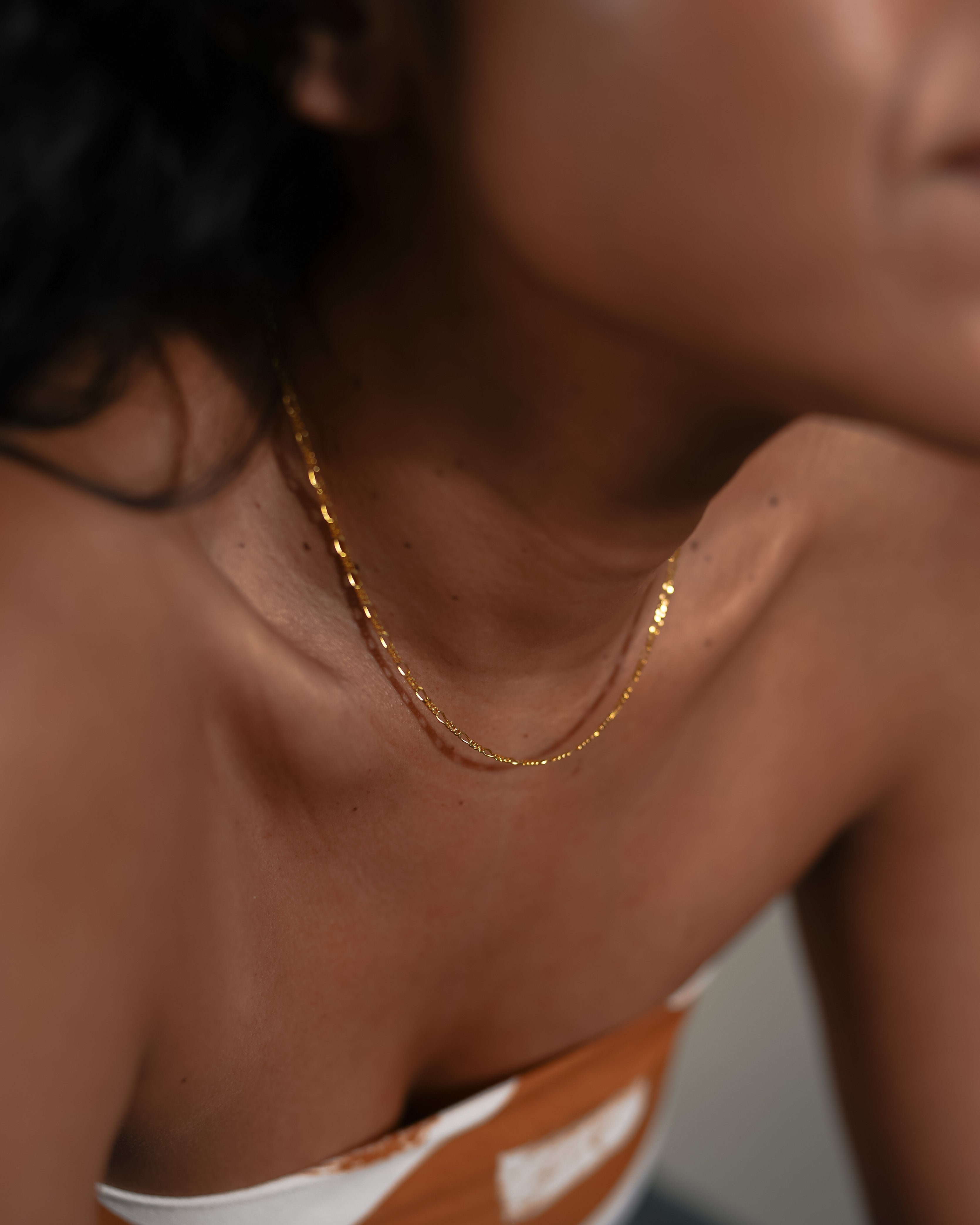 A dainty take after the classic Figaro chain This delicate style will add the perfect subtle sparkle to any outfit. With its small links, it has a graceful and timeless look that is sure to become a staple piece.