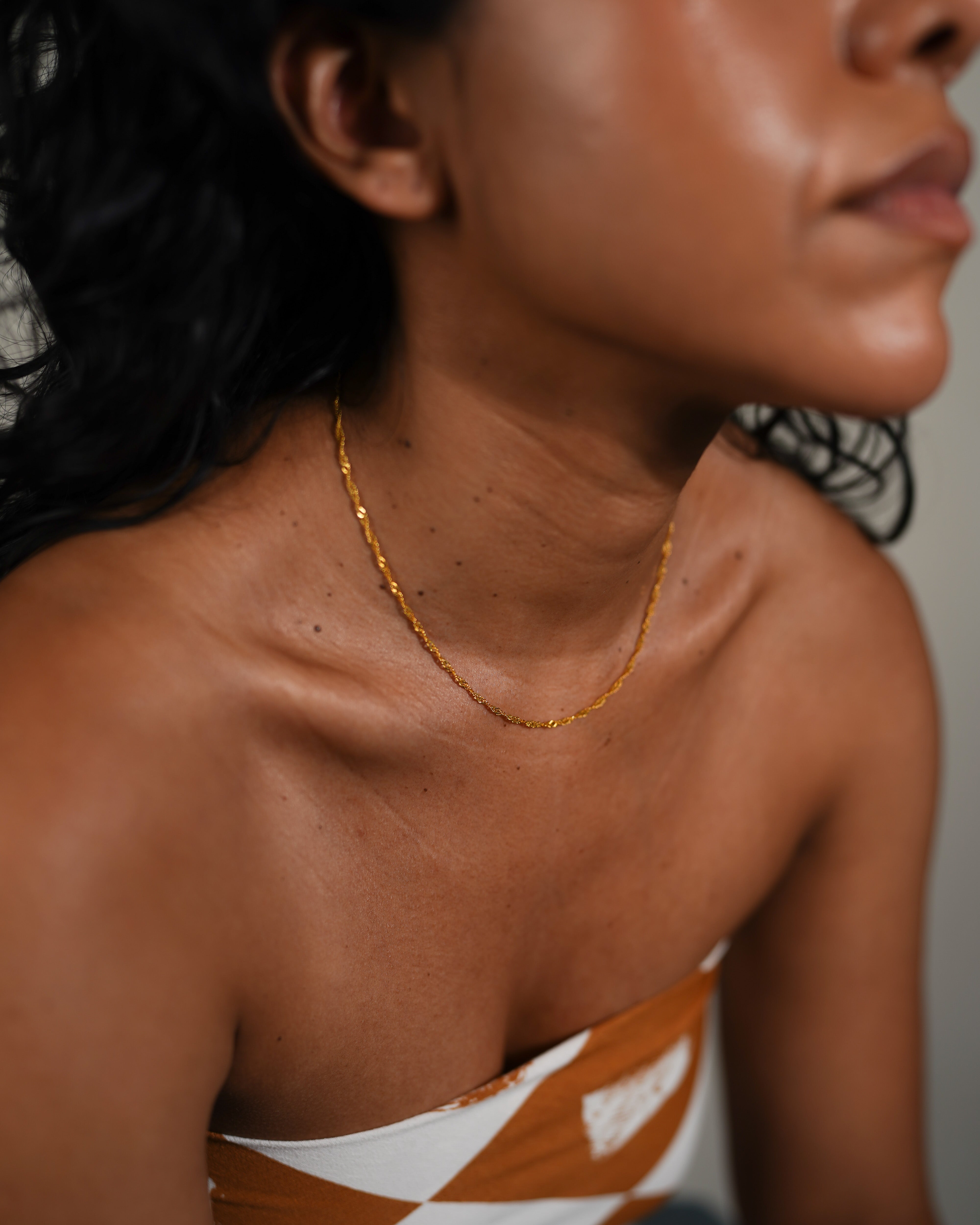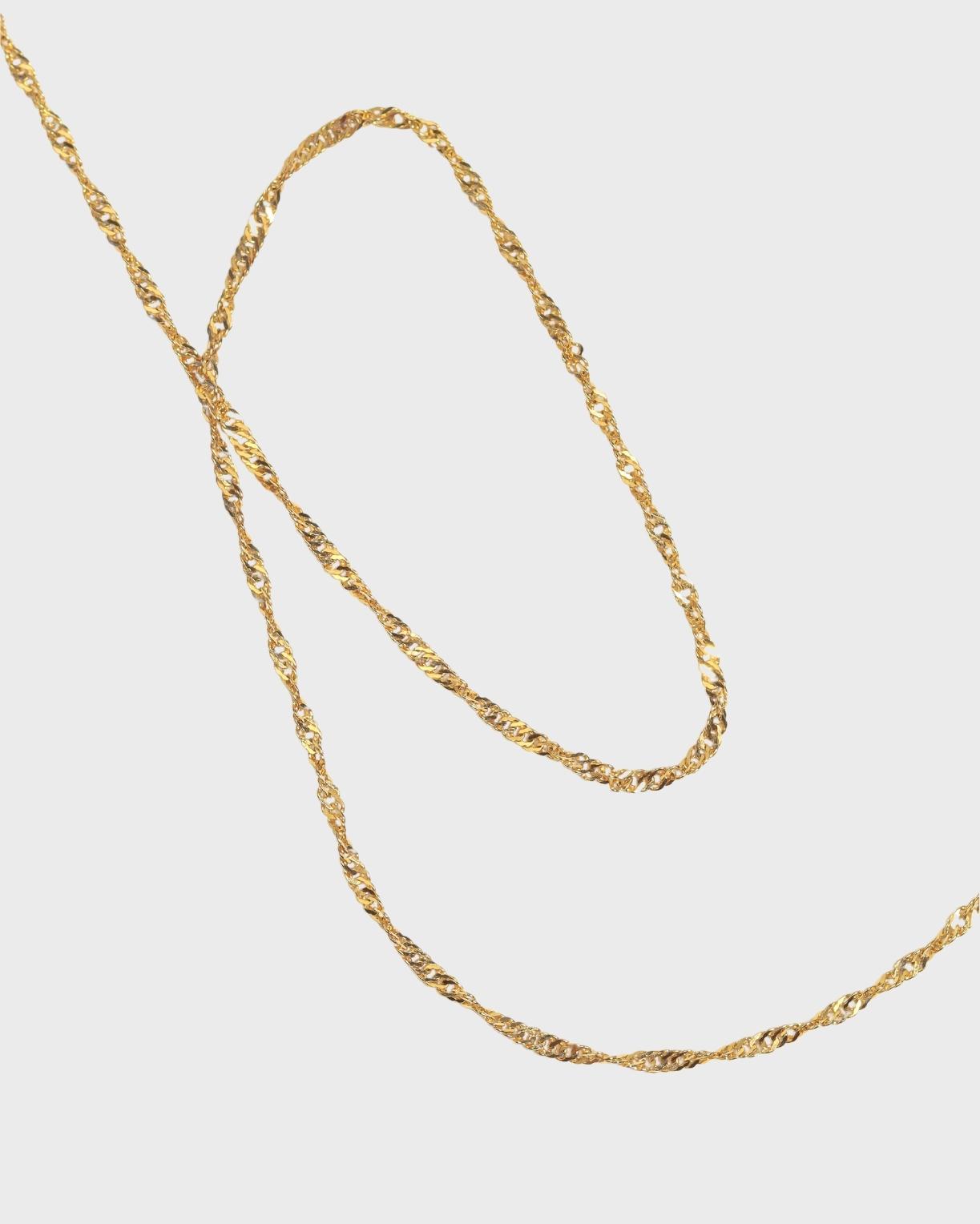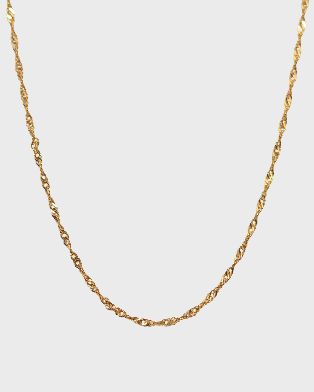 A thin gold chain in a twisted style. Perfect to be worn alone or layered with a pendant necklace. With its subtle shimmer and unique texture, the Dainty Twist Chain adds a special touch to any look. It's a timeless addition to your jewellery collection.