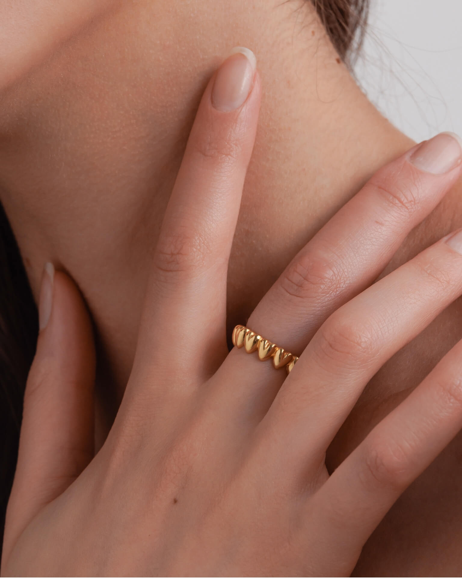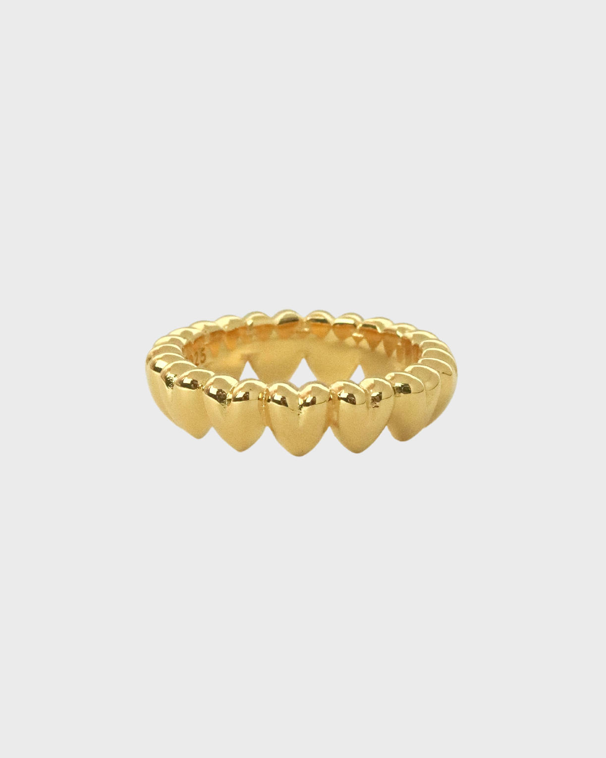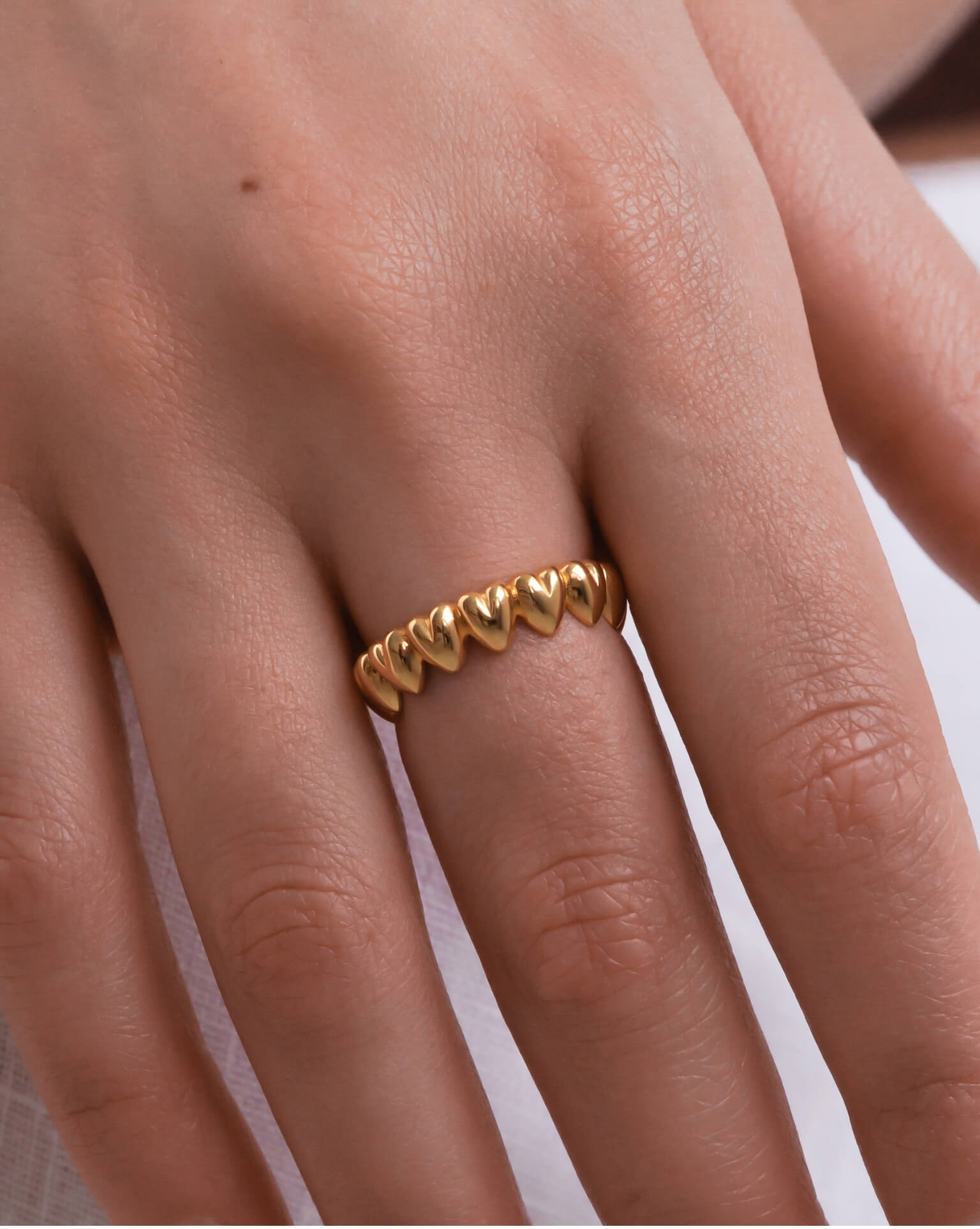 This audacious Love All Around Ring is the perfect adornment for any outfit ensemble. Crafted from precious metal, the unique and bold design is accented by intricate bubble hearts that encircle it, adding a chic yet delicate touch. It's the ideal way to express your sentiment of affection or add an elegant touch to an everyday look.